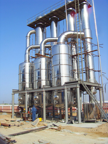 各效蒸發(fā)器、各效分離器、冷凝器、熱壓泵、真空及排水系統(tǒng)、各效料液輸送泵、操作平臺(tái)、電器儀表控制柜及閥門(mén)、管路等系統(tǒng)組成。